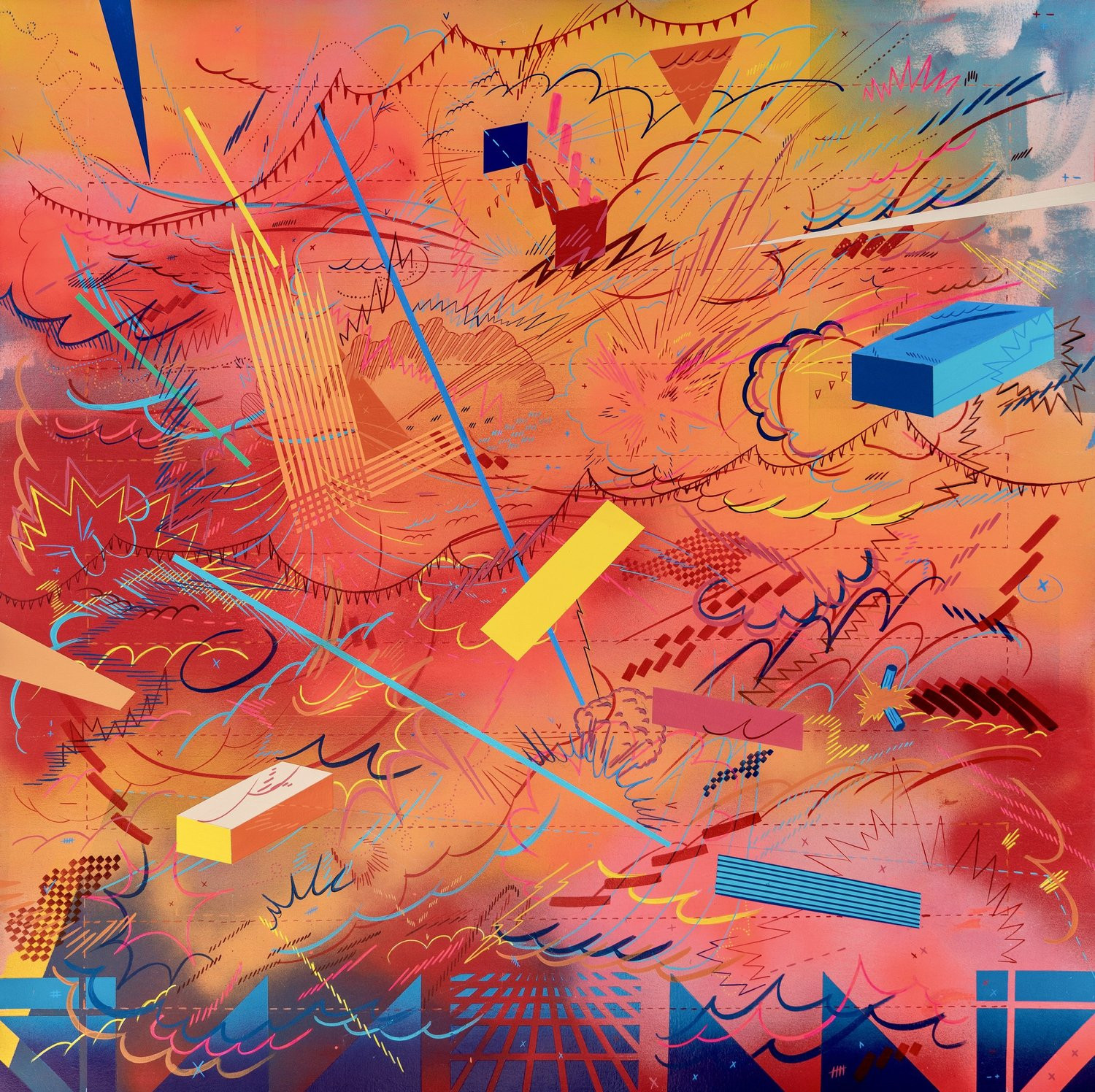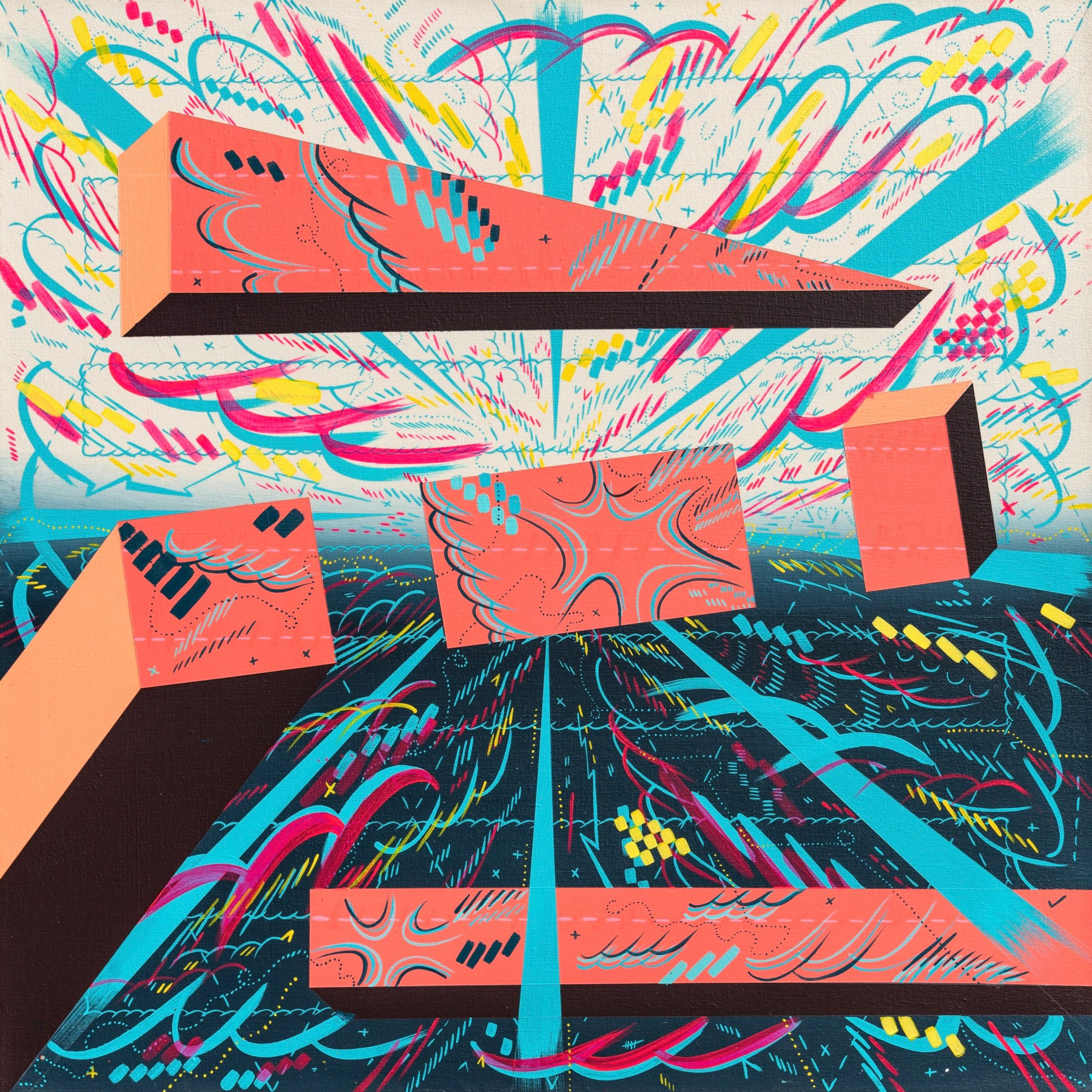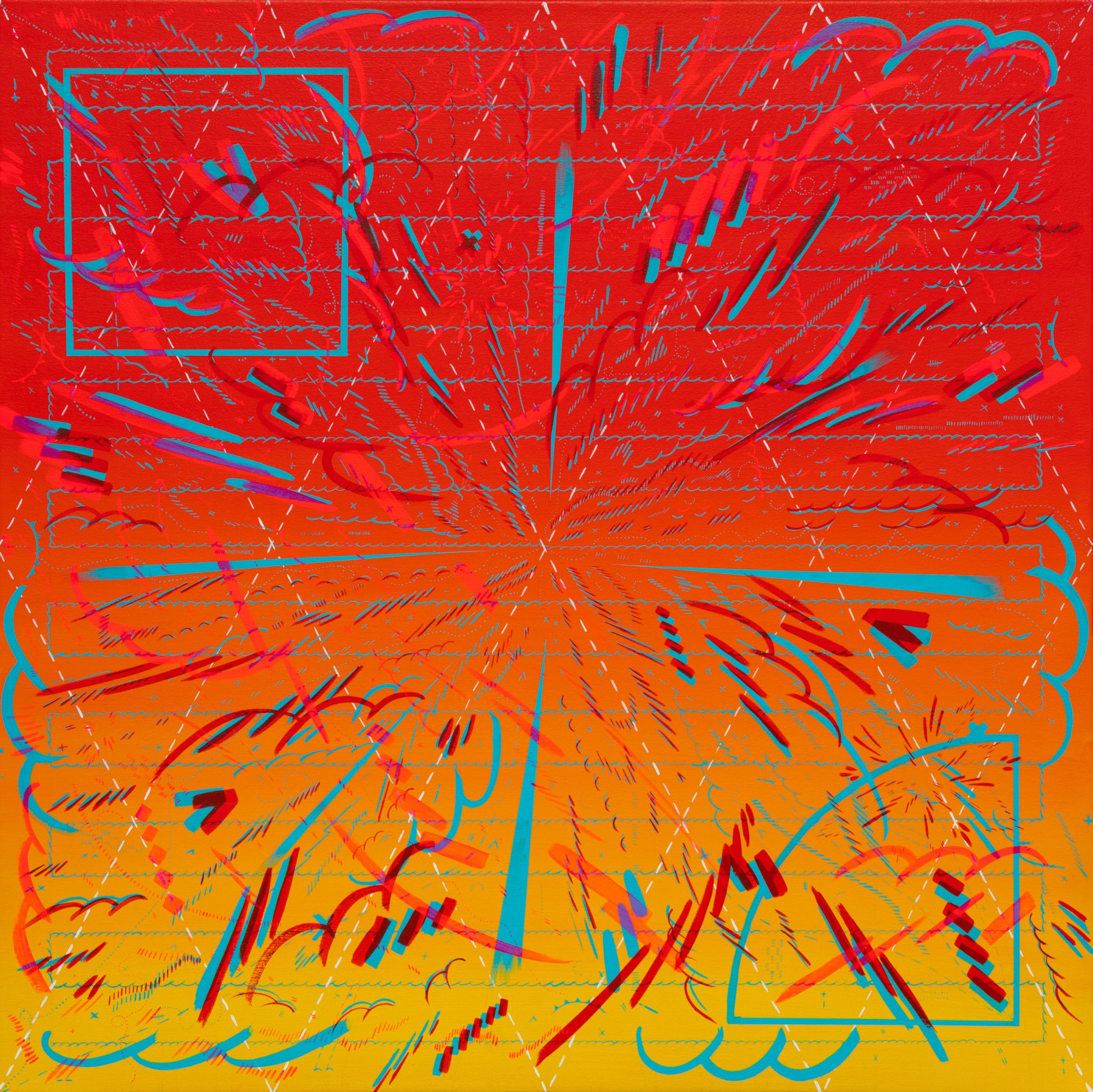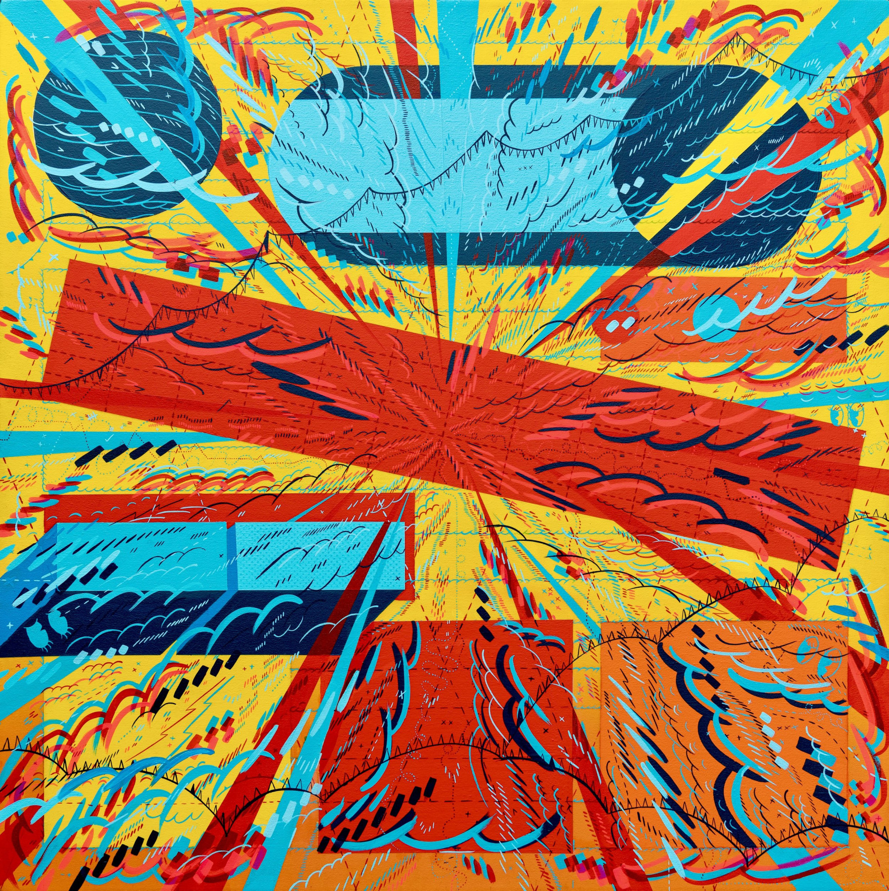 I am inspired by a broad range of historical sources including maps, diagrams, pinball machines, and calligraphy. As a process-oriented abstract painter, I embrace a systematic exploration of chaos and control. My work harmonizes an array of disparate themes: esoteric expressions of cloud chambers, the didactic lines of weather maps, cartography's precise geometry, the random behavior of metal balls inside pinball machines, the unseen yet potent influences that shape our universe, and cartoon explosions. At the heart of it, my paintings harken back to the cause-and-effect dynamics of the cosmos while resembling a fireworks display unpredictably propelling energy into the night sky.