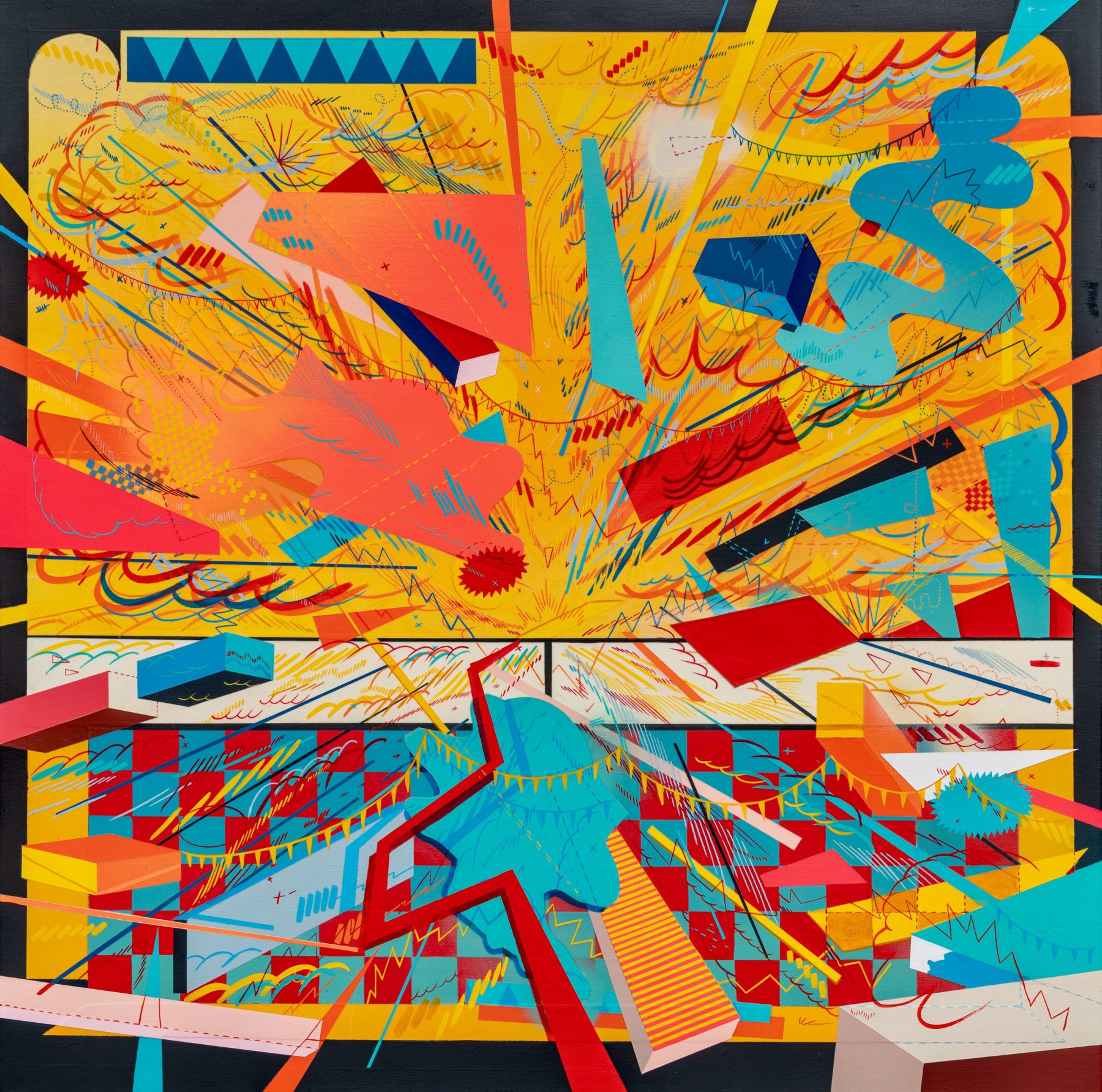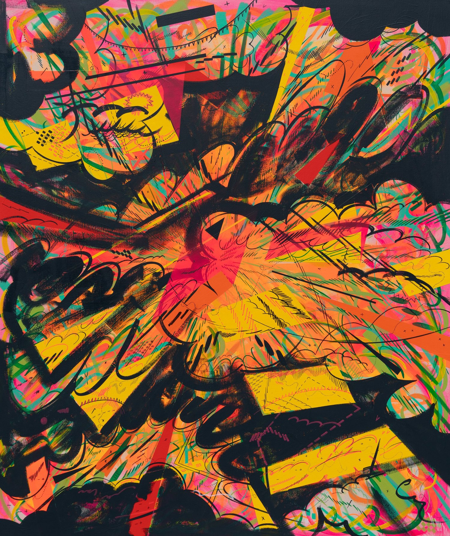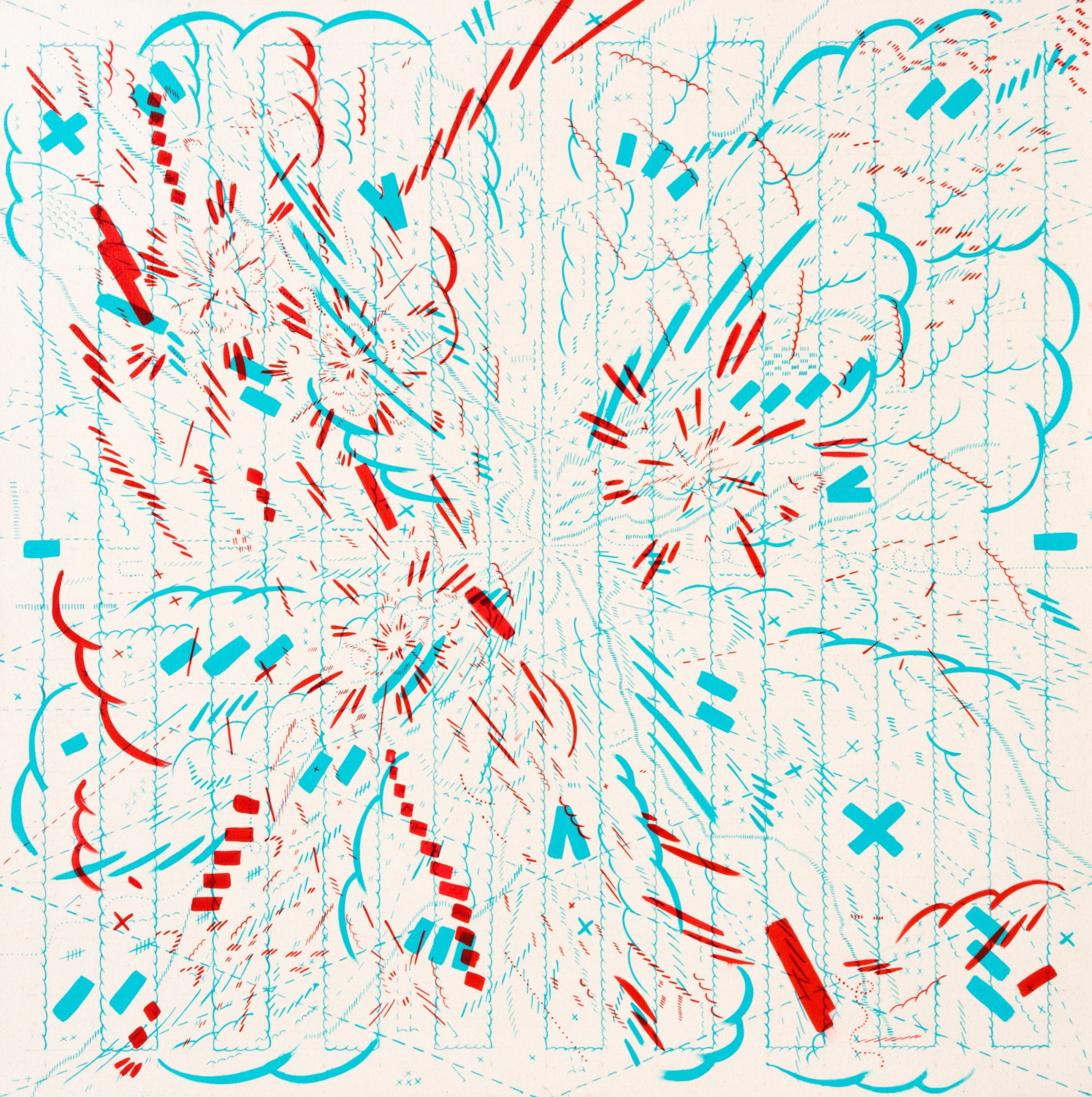 I am inspired by a broad range of historical sources including maps, diagrams, pinball machines, and calligraphy. As a process-oriented abstract painter, I embrace a systematic exploration of chaos and control. My work harmonizes an array of disparate themes: esoteric expressions of cloud chambers, the didactic lines of weather maps, cartography's precise geometry, the random behavior of metal balls inside pinball machines, the unseen yet potent influences that shape our universe, and cartoon explosions. At the heart of it, my paintings harken back to the cause-and-effect dynamics of the cosmos while resembling a fireworks display unpredictably propelling energy into the night sky.