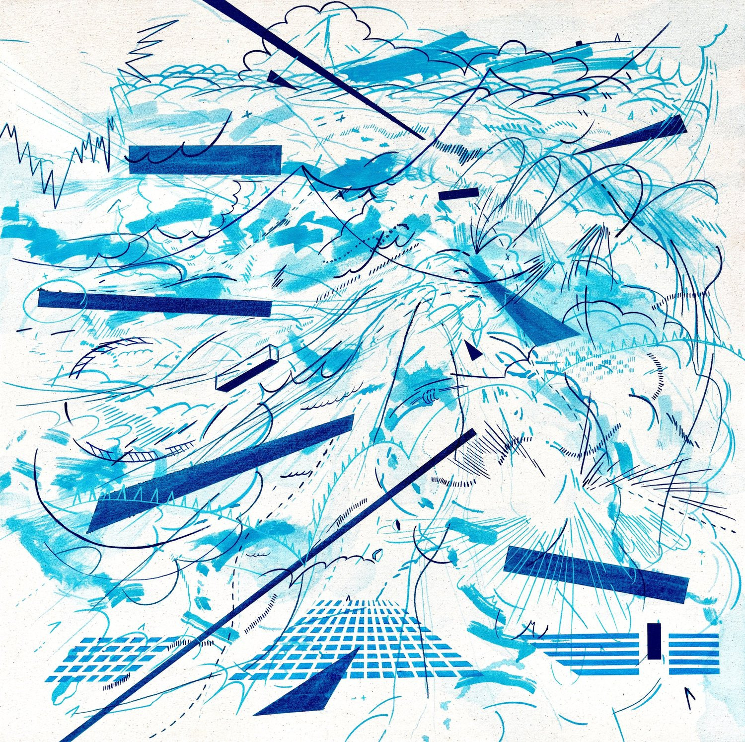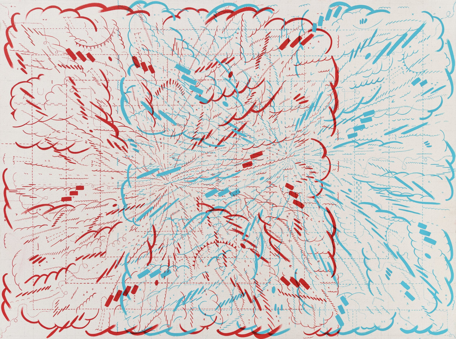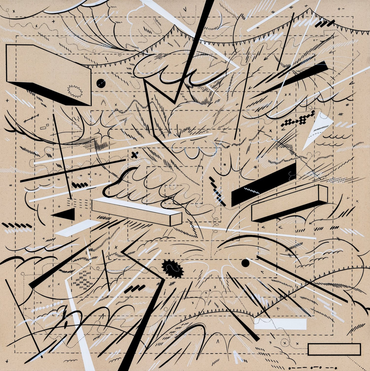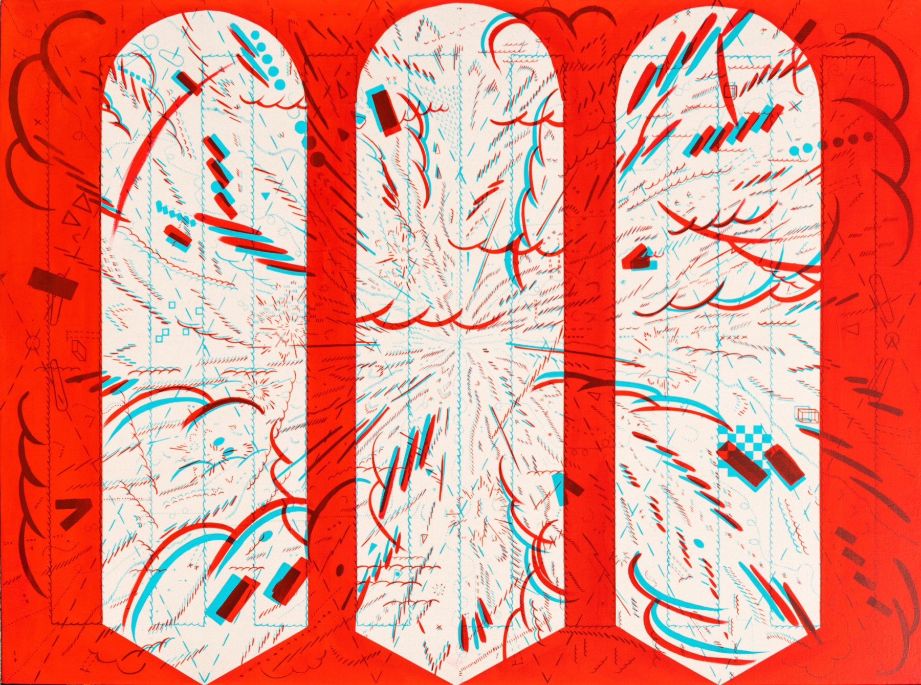 I am inspired by a broad range of historical sources including maps, diagrams, pinball machines, and calligraphy. As a process-oriented abstract painter, I embrace a systematic exploration of chaos and control. My work harmonizes an array of disparate themes: esoteric expressions of cloud chambers, the didactic lines of weather maps, cartography's precise geometry, the random behavior of metal balls inside pinball machines, the unseen yet potent influences that shape our universe, and cartoon explosions. At the heart of it, my paintings harken back to the cause-and-effect dynamics of the cosmos while resembling a fireworks display unpredictably propelling energy into the night sky.