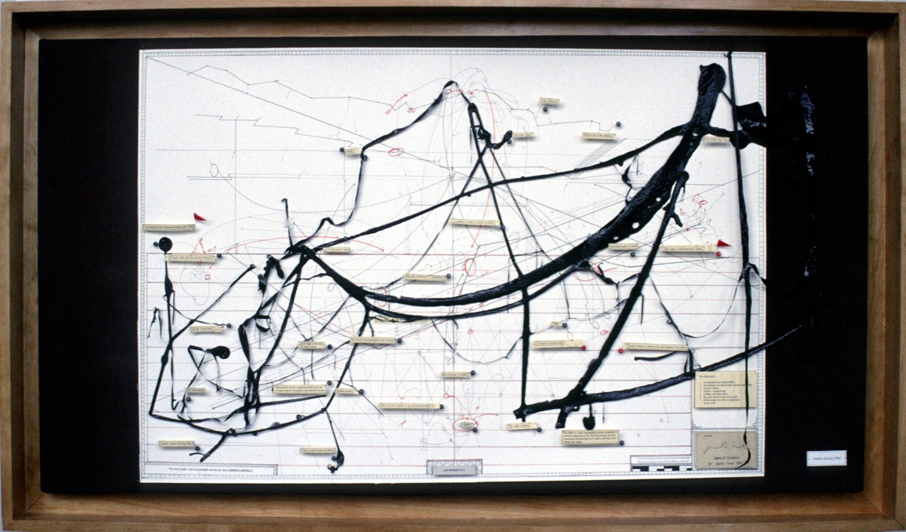 These pieces were primarily produced starting in 2000 during my time in art school and in 2018 in preparation for a group show in Seattle. These pieces allowed me to explore the intersection between abstraction and meaning. These diagrams can be characterized as abstract assemblages with recognizable reference points. I thought of them as earnest attempts at condensing rich, complex subject matter down to drips of paint through juxtaposing traditional abstract expressionist painting methods with cartography, proofreader's marks, and amateur roadside museum techniques of display, classification, and critique.