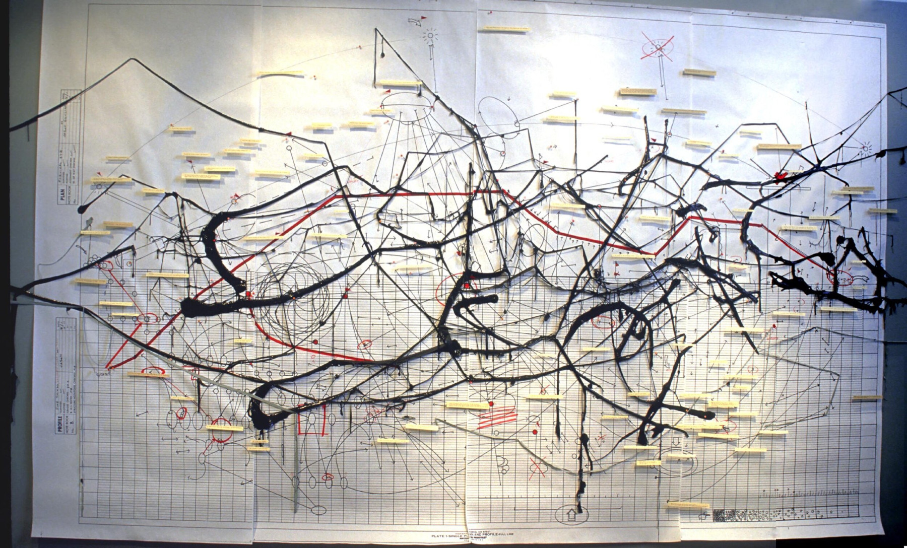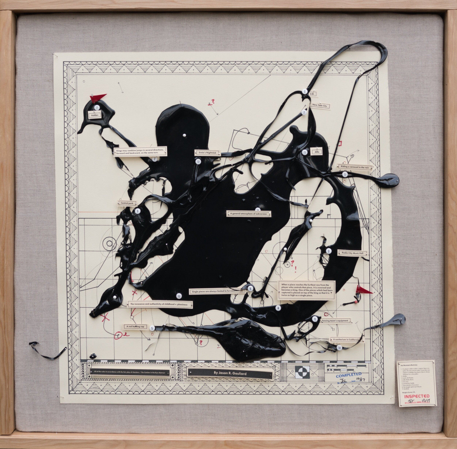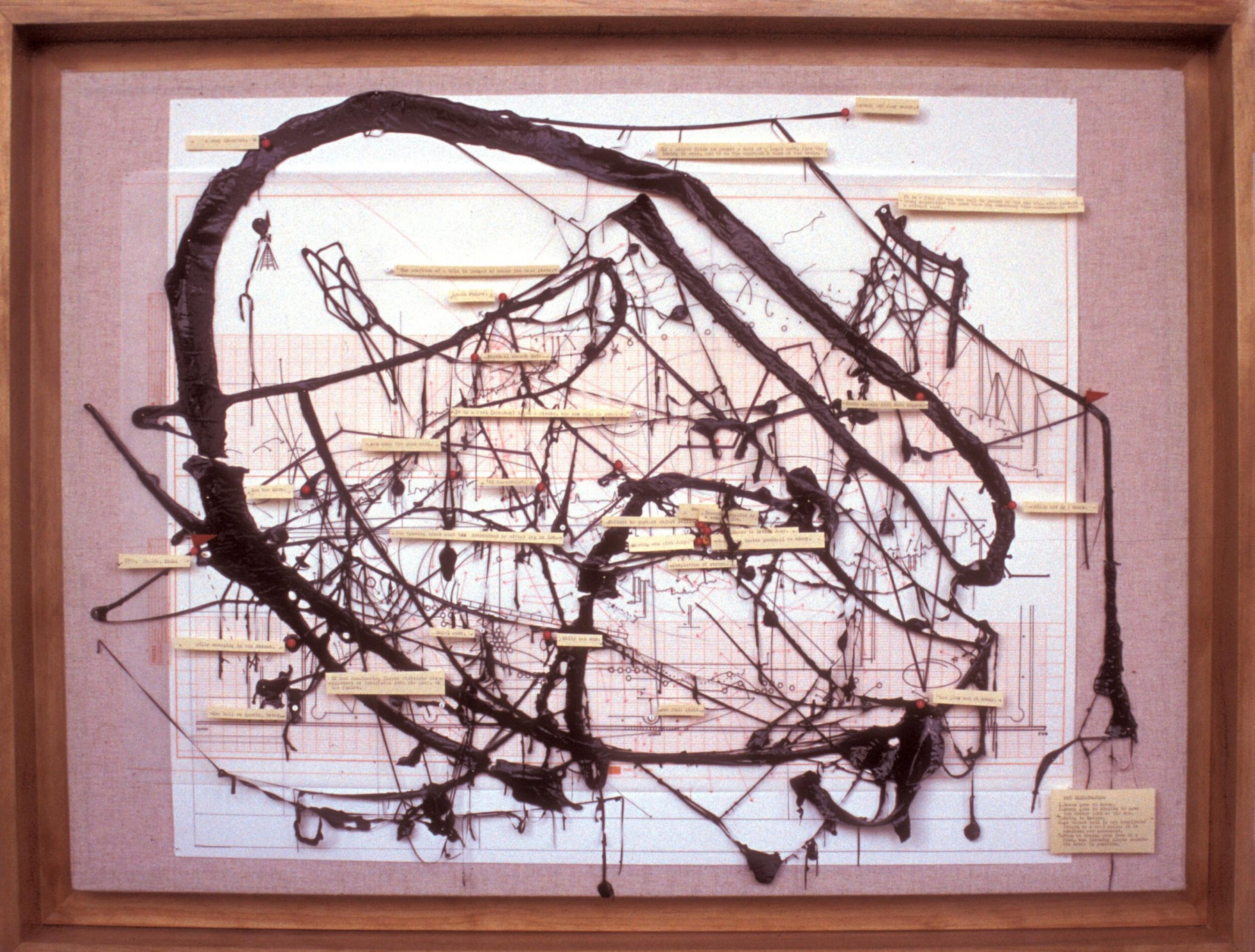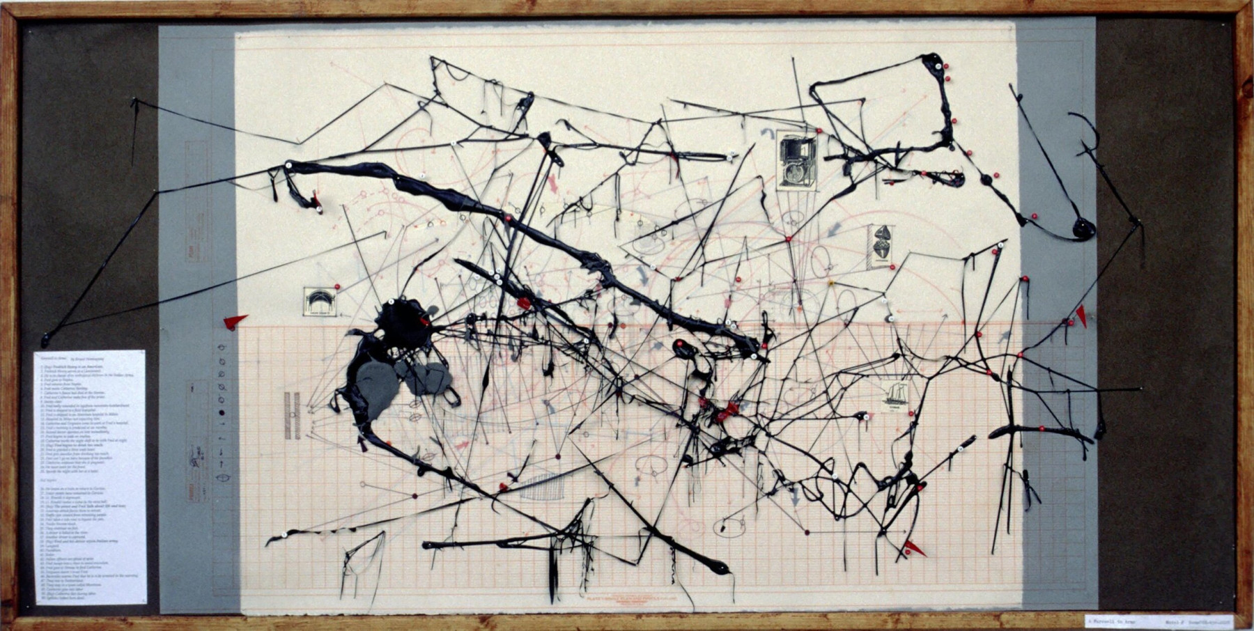 These pieces were primarily produced starting in 2000 during my time in art school and in 2018 in preparation for a group show in Seattle. These pieces allowed me to explore the intersection between abstraction and meaning. These diagrams can be characterized as abstract assemblages with recognizable reference points. I thought of them as earnest attempts at condensing rich, complex subject matter down to drips of paint through juxtaposing traditional abstract expressionist painting methods with cartography, proofreader's marks, and amateur roadside museum techniques of display, classification, and critique.