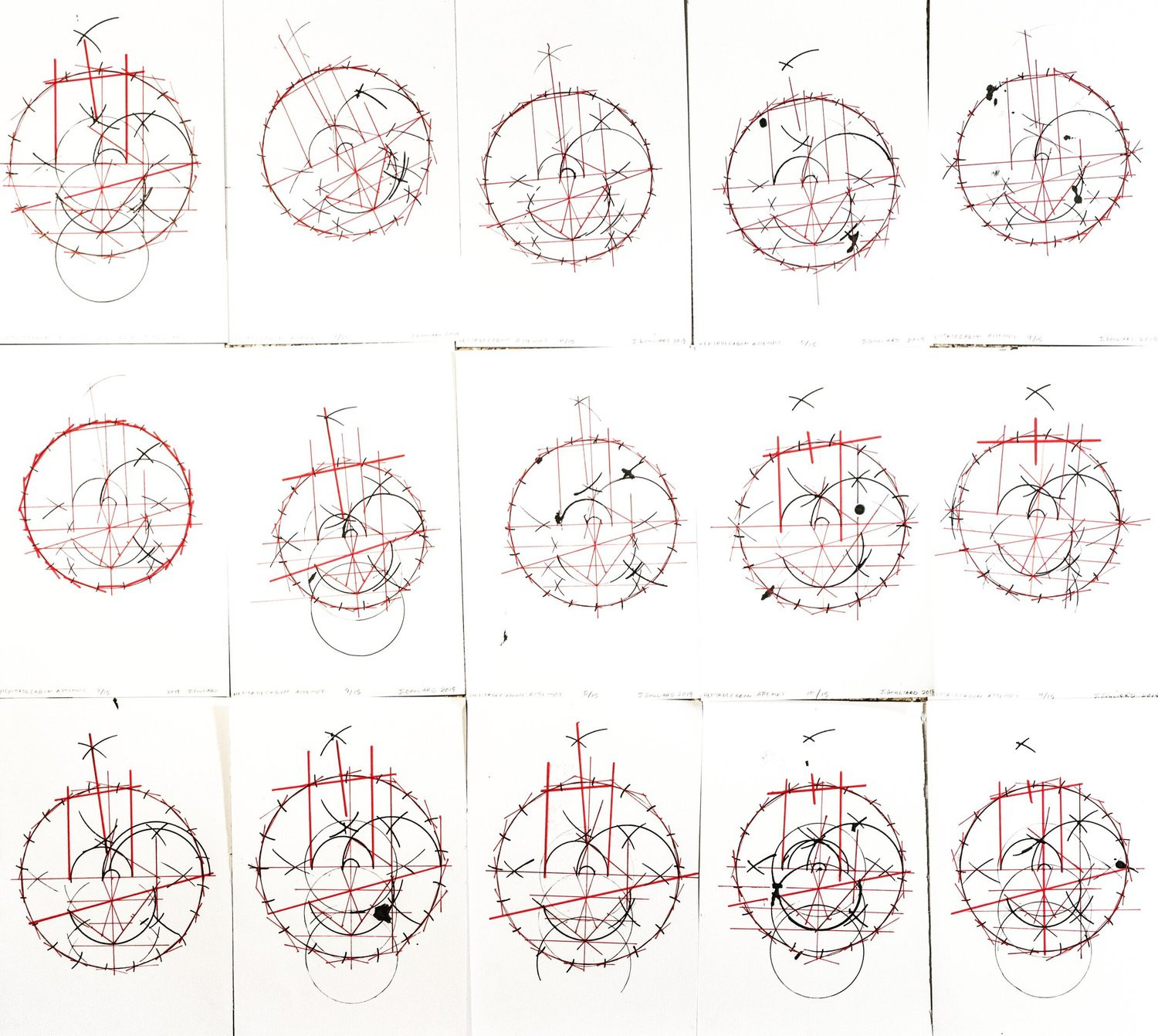 These pieces were produced between the years 2000 and 2020, though I still draw almost every day. Most of them served as layers to my series of diagrams. Some of them were part of a series of drawings sent out as holiday cards.