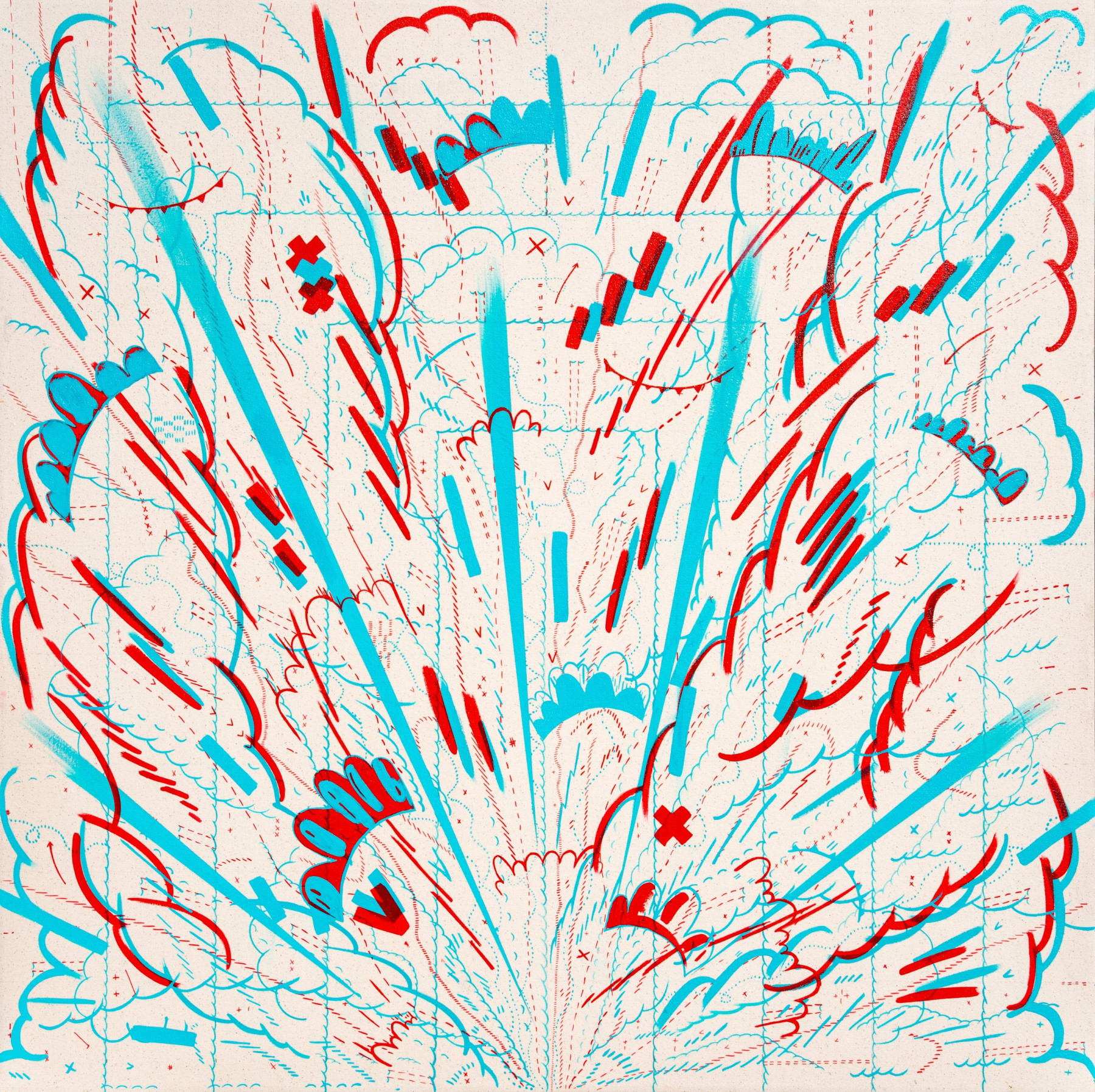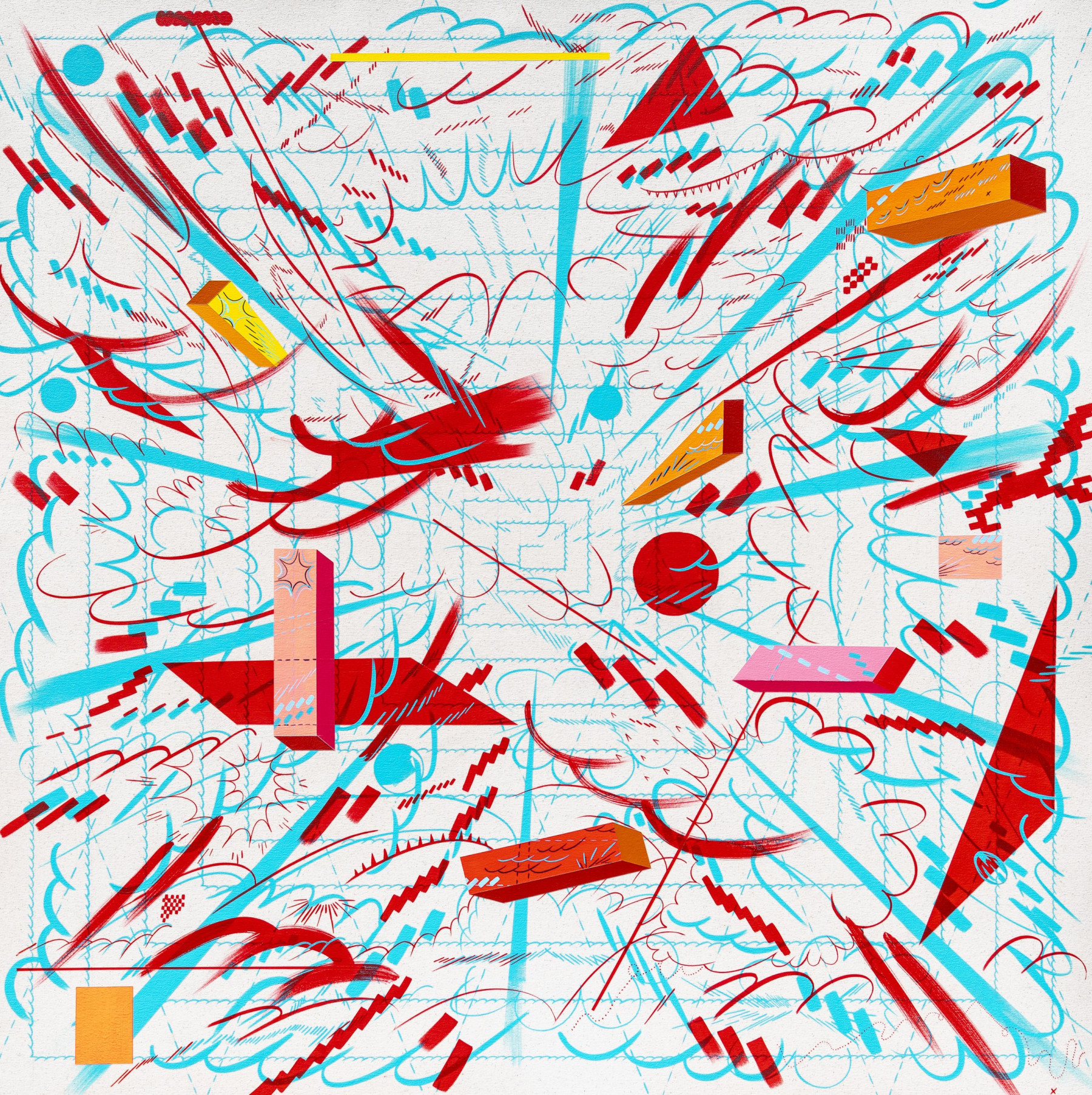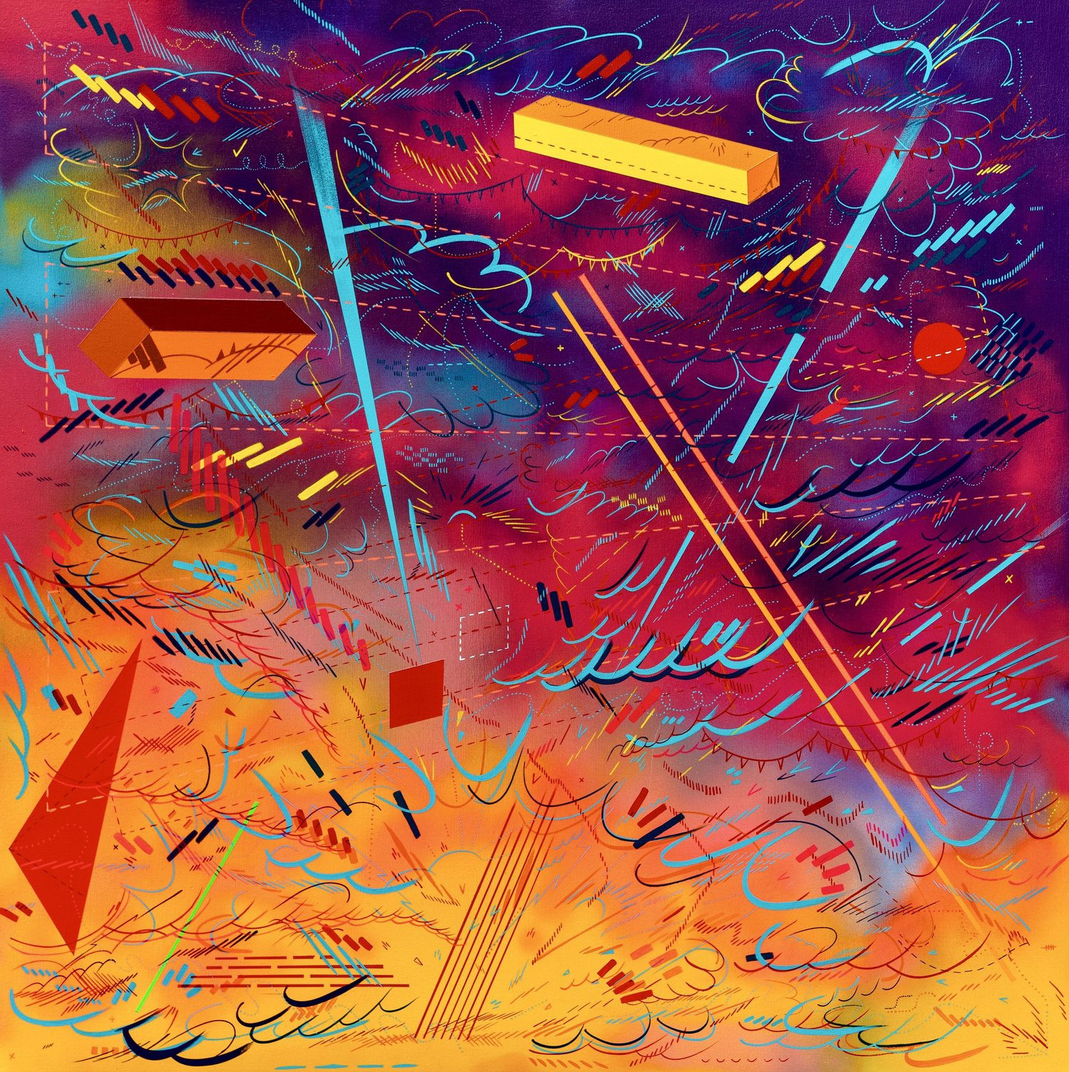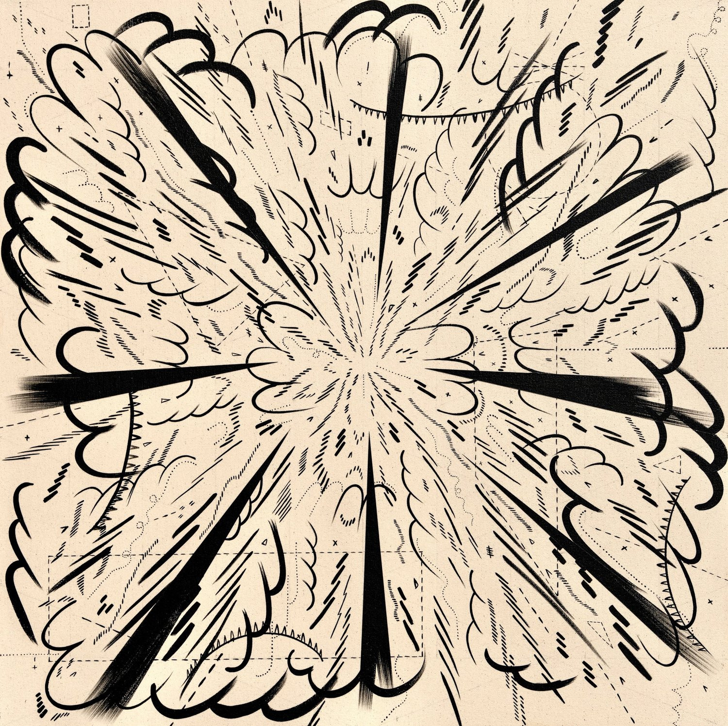 I am inspired by a broad range of historical sources including maps, diagrams, pinball machines, and calligraphy. As a process-oriented abstract painter, I embrace a systematic exploration of chaos and control. My work harmonizes an array of disparate themes: esoteric expressions of cloud chambers, the didactic lines of weather maps, cartography's precise geometry, the random behavior of metal balls inside pinball machines, the unseen yet potent influences that shape our universe, and cartoon explosions. At the heart of it, my paintings harken back to the cause-and-effect dynamics of the cosmos while resembling a fireworks display unpredictably propelling energy into the night sky.