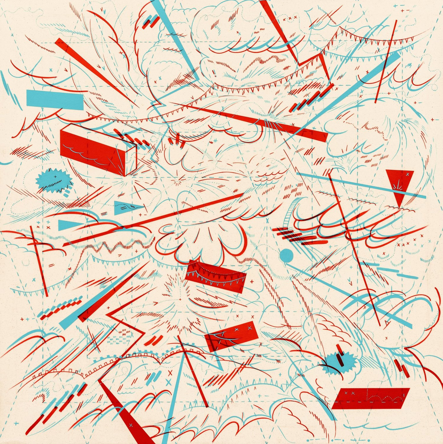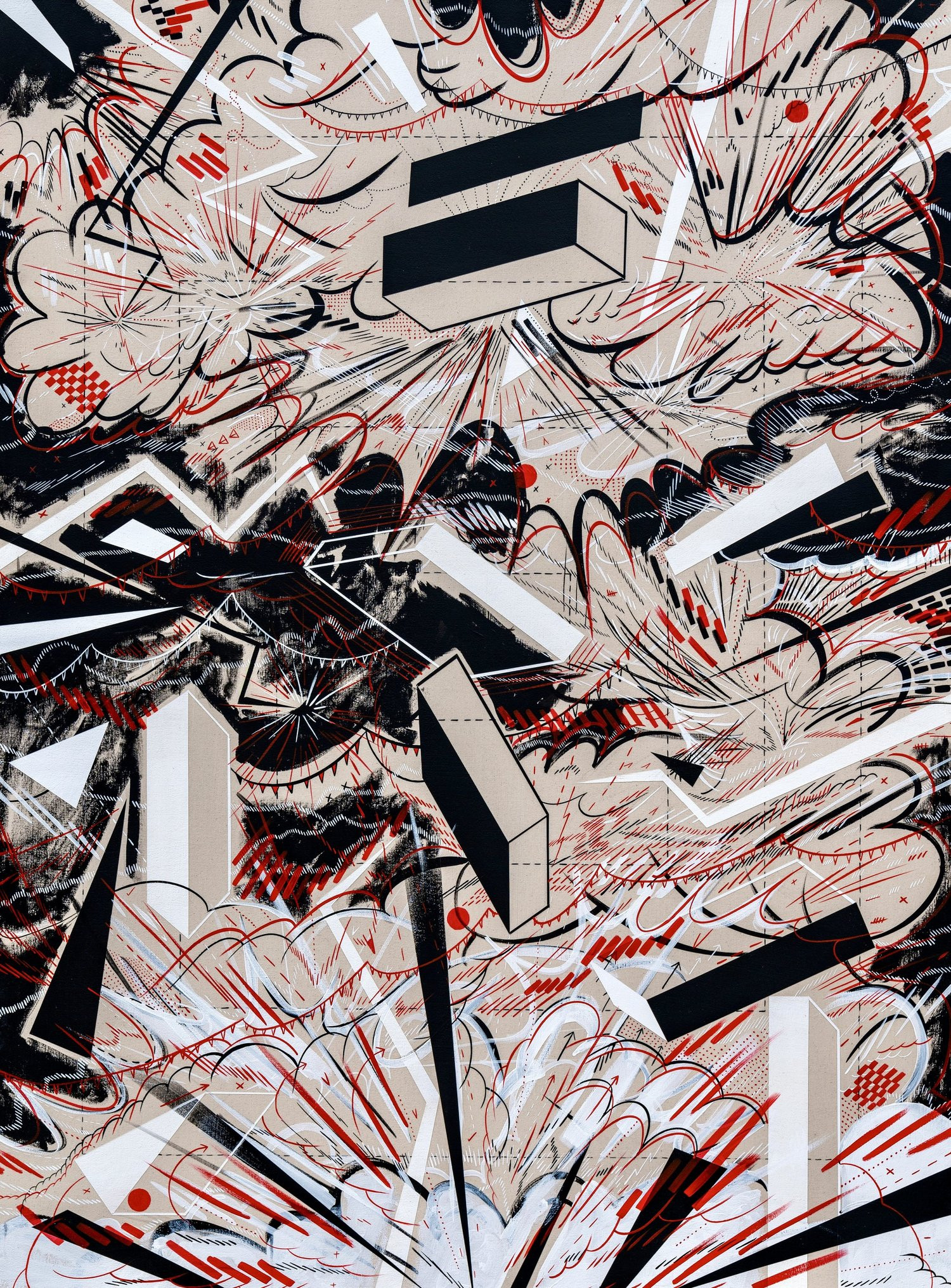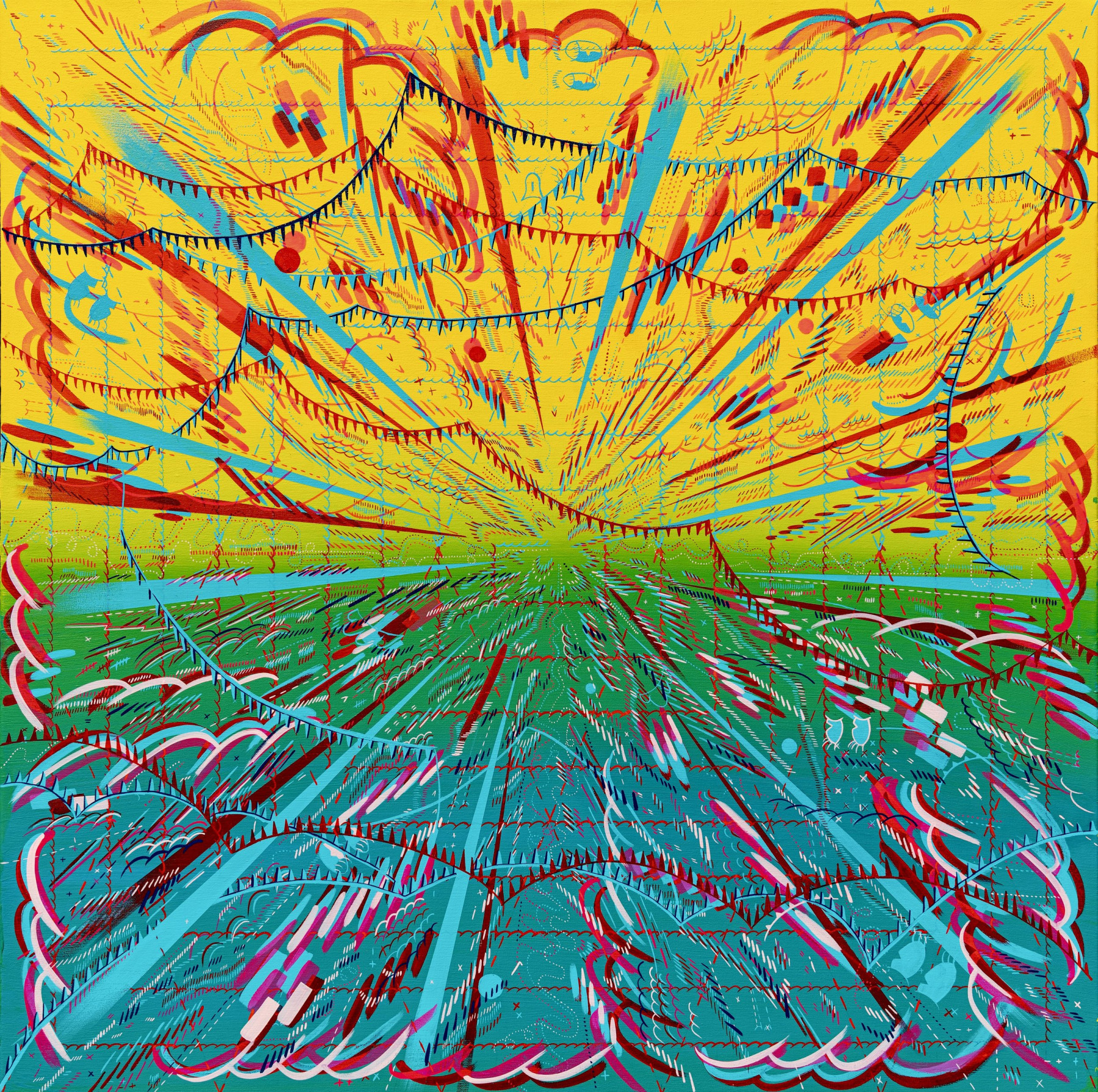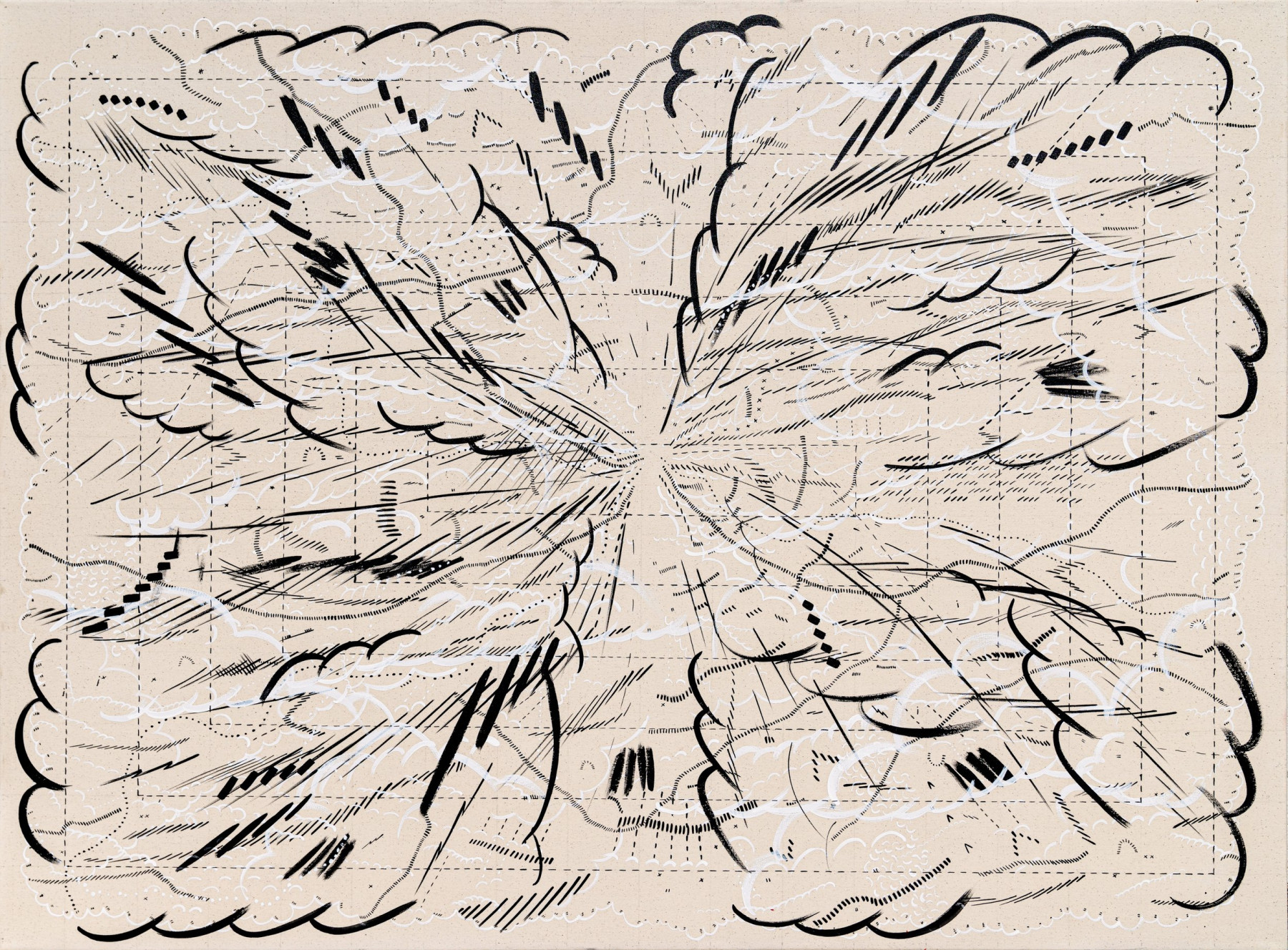 I am inspired by a broad range of historical sources including maps, diagrams, pinball machines, and calligraphy. As a process-oriented abstract painter, I embrace a systematic exploration of chaos and control. My work harmonizes an array of disparate themes: esoteric expressions of cloud chambers, the didactic lines of weather maps, cartography's precise geometry, the random behavior of metal balls inside pinball machines, the unseen yet potent influences that shape our universe, and cartoon explosions. At the heart of it, my paintings harken back to the cause-and-effect dynamics of the cosmos while resembling a fireworks display unpredictably propelling energy into the night sky.